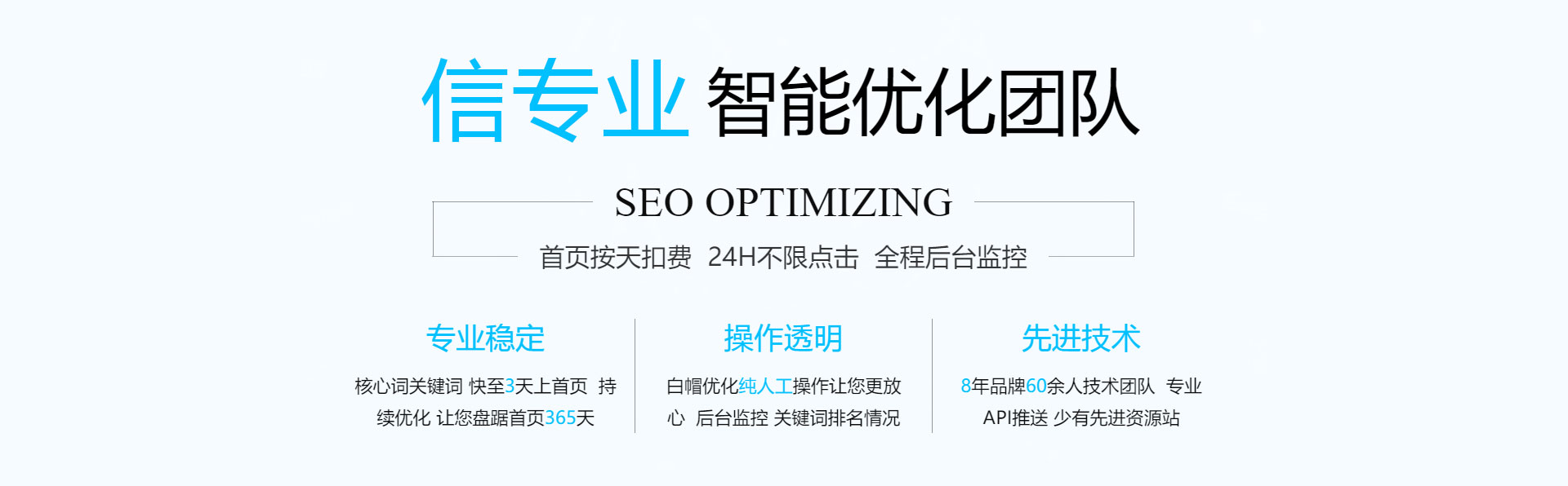 關(guān)鍵詞優(yōu)化,無效果退款!專業(yè)技術(shù)管控賬戶,減少無效點擊,全方位網(wǎng)絡(luò)推廣,讓您的信息遍布互聯(lián)網(wǎng)。
